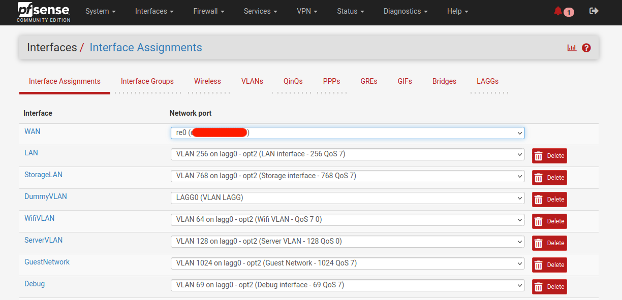Note, that once the Pfsense has been configured with all its respective VLANs and LAGG. The other end has to be configured as well in order to use both VLAN and LACP, commonly a switch. This process will differ from hardware to hardware.